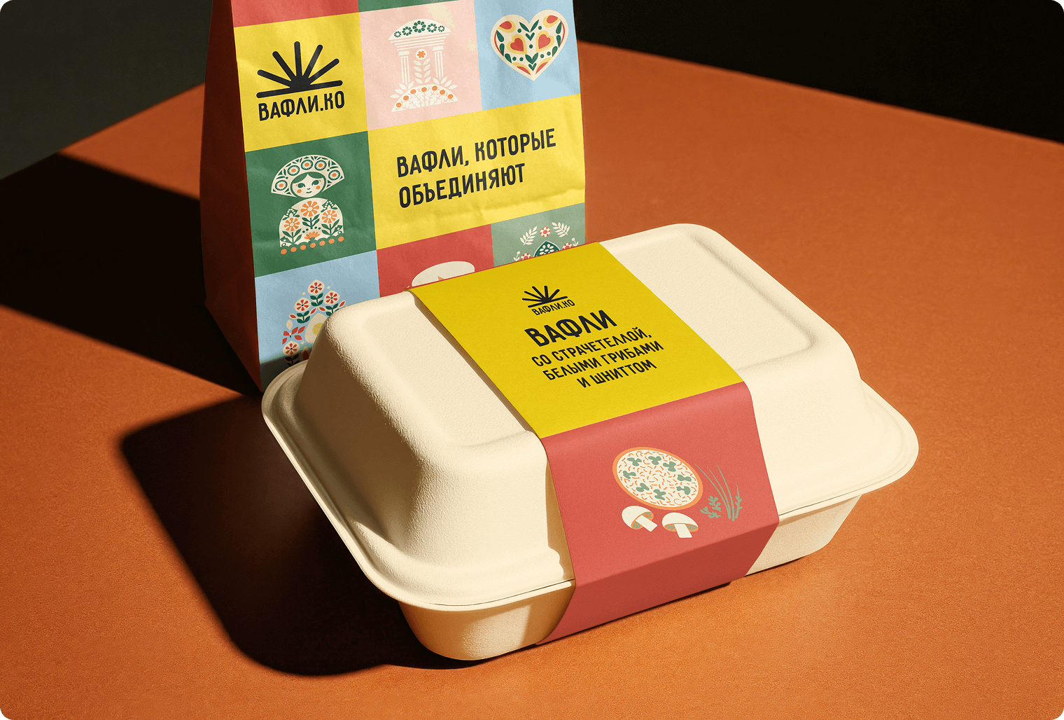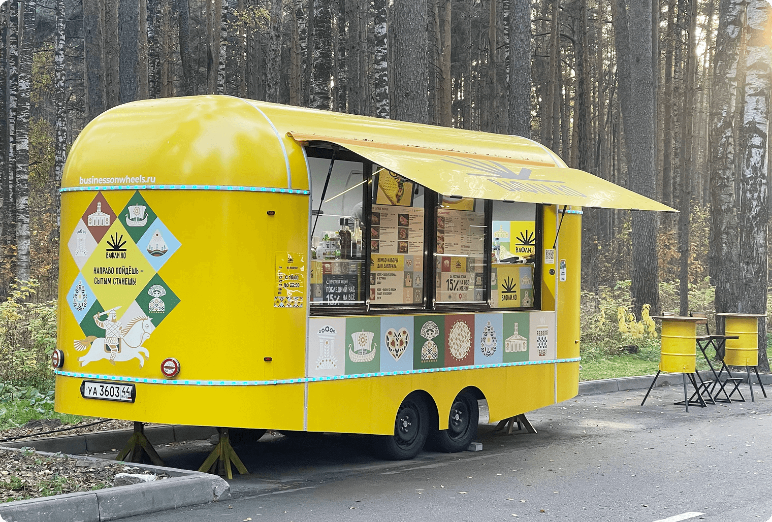 В итоге мы получили яркий, тёплый и визуально узнаваемый стиль. Он не копирует готовые решения, не уходит в лубок, но чётко встроен в контекст города. Бренд «Вафлико» уже узнают на улицах, у него формируется своя аудитория, а визуальный язык успешно реализован на ключевых носителях — от меню и оформления фудтрака до упаковки и фирменной коммуникации. Айдентика заложена как масштабируемая система, готовая к развитию и росту бренда в будущем.