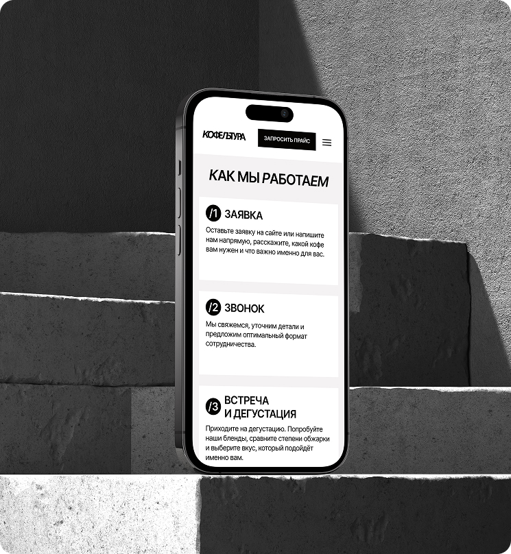Мы показали не безликий бренд, а людей. Фото команды сняты в естественной атмосфере, без постановки. Тексты написаны от первого лица — будто ребята сами рассказывают, как всё устроено. Пользователь сразу чувствует эмоциональный контакт: он знает, кто стоит за кофе, который он пьёт. При этом такой подход демонстрирует прозрачность и честность: на сайте подробно рассказано о каждом этапе сотрудничества, и становится понятно, как легко и удобно работать с компанией. Это создаёт доверие и подчёркивает преимущества взаимодействия с командой.