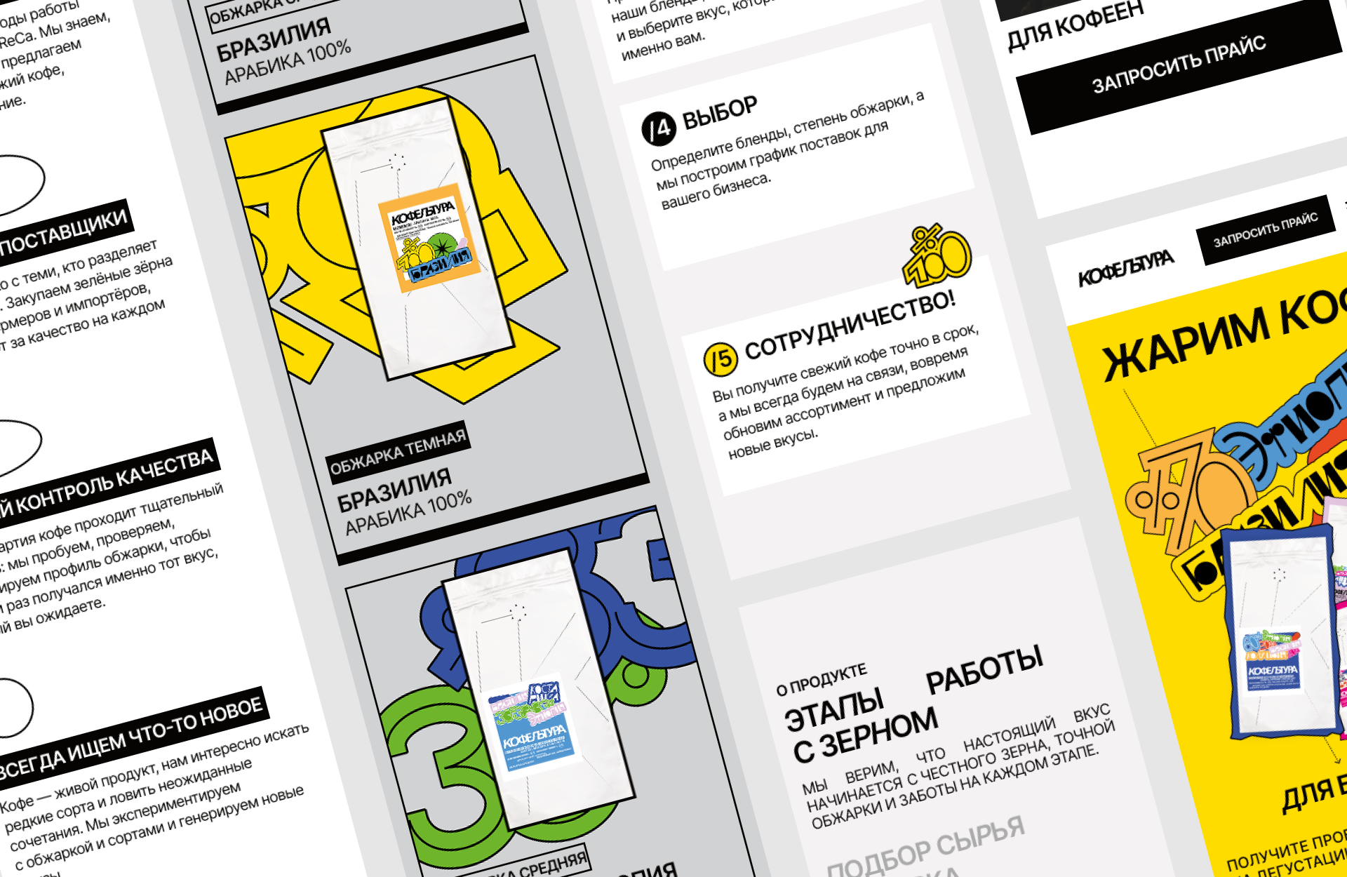 В итоге получился сайт, который не просто рассказывает о кофе, а передаёт характер бренда Кофельтуры, объединяет сообщество обжарщиков, бариста и ценителей, делает процесс покупки и сотрудничества лёгким и приятным, а визуальный язык — ярким, современным и эмоциональным.